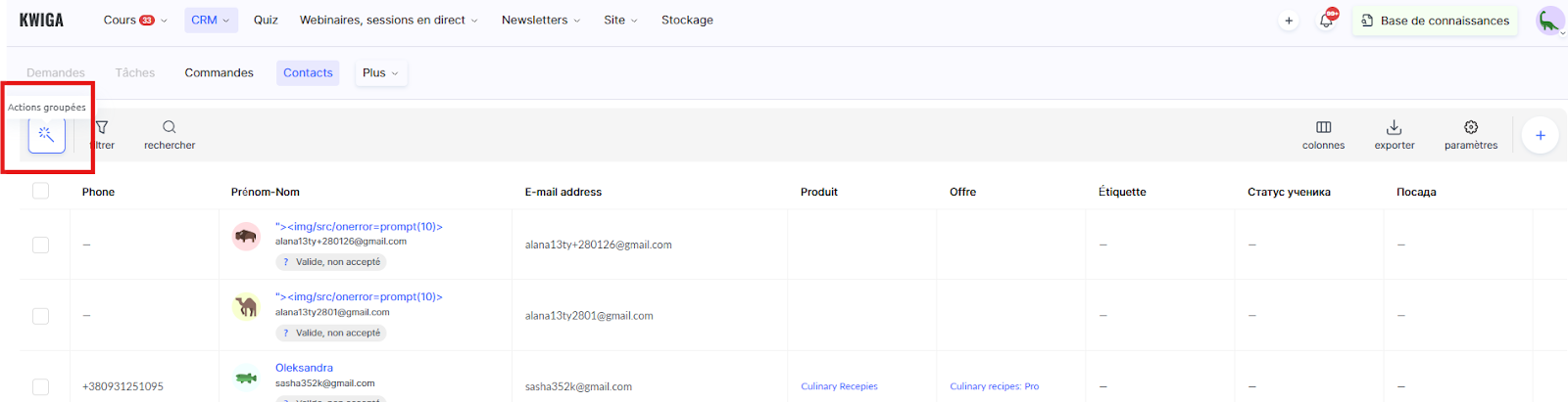 Remarque : le CRM Kwiga permet aussi d’effectuer des actions en masse pour tous les contacts ou pour des groupes sélectionnés.