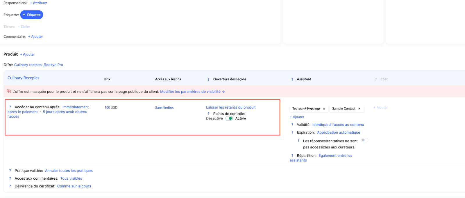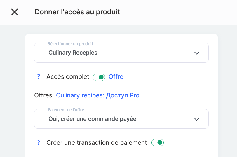 Modification de la commande : lorsque vous devez changer les paramètres d’accès au sein de la formule actuelle. Par exemple, ajuster le nombre de leçons disponibles, modifier le calendrier de mise à disposition des contenus, désactiver les vérifications des exercices, etc.