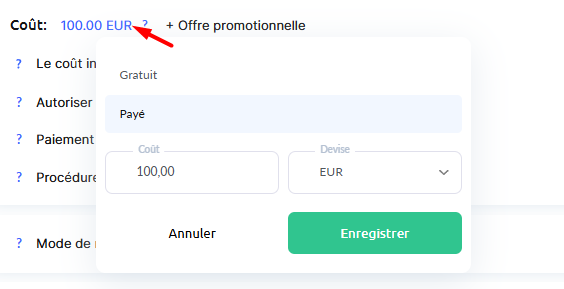 Pour définir la méthode de paiement, vous devez d’abord fixer le prix.Sélectionnez le système de paiement que vous souhaitez utiliser pour recevoir les paiements liés à cette offre.