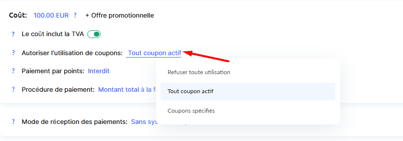 Vous pouvez également interdire l’utilisation de tout coupon de réduction, autoriser tous les coupons actifs, ou limiter l’usage à certains coupons que vous créez spécifiquement pour cette offre. Plus d’informations sur les coupons sont disponibles dans un article séparé.