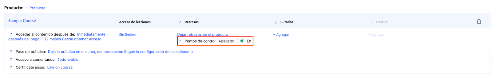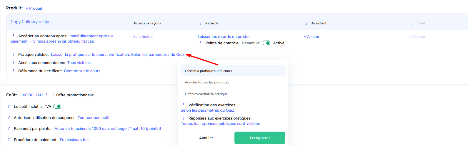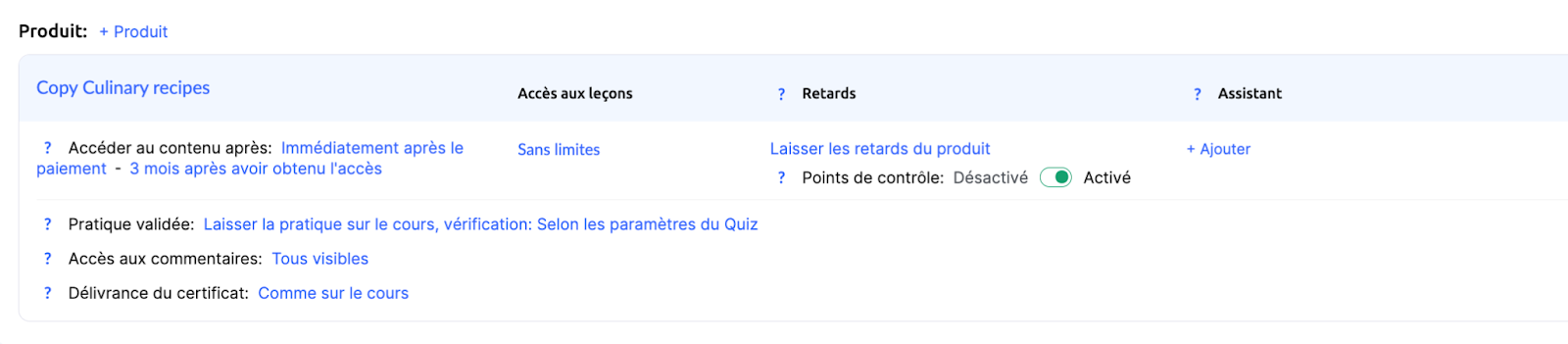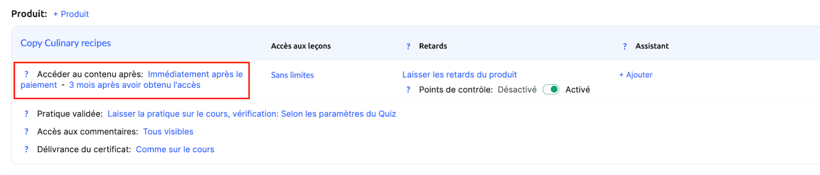 Si le cours comprend des points de contrôle (par exemple des devoirs ou quiz obligatoires pour progresser), laissez cette option activée dans l’offre également.