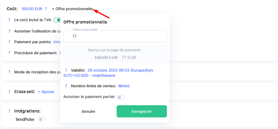 Entonnoir par défaut : vous pouvez indiquer l’entonnoir de vente auquel les commandes de cette offre seront attribuées ou laisser le champ vide.