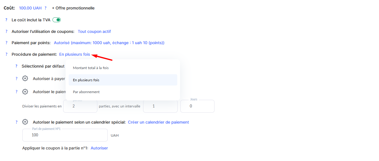 Paiement en plusieurs fois : divise le coût total en plusieurs paiements, en configurant le nombre d’échéances, l’intervalle entre elles et le montant de chaque versement.