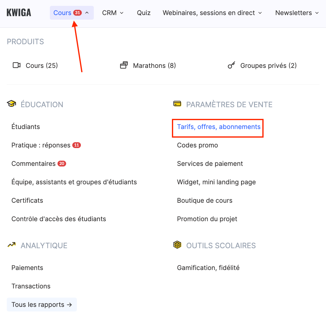 Ouvrez le menu supérieur Cours et, dans le bloc de configuration des ventes, sélectionnez Tarifs, offres.