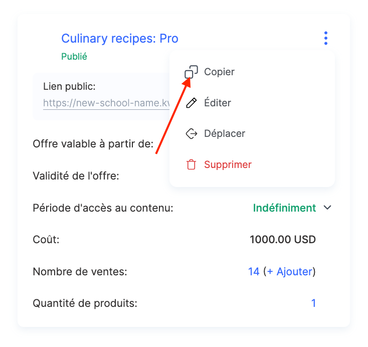 Si vous devez uniquement modifier le calendrier de publication des leçons, il n’est pas nécessaire de copier le cours. Il suffit de créer une nouvelle offre et de redéfinir directement dans celle-ci les délais de publication des leçons.