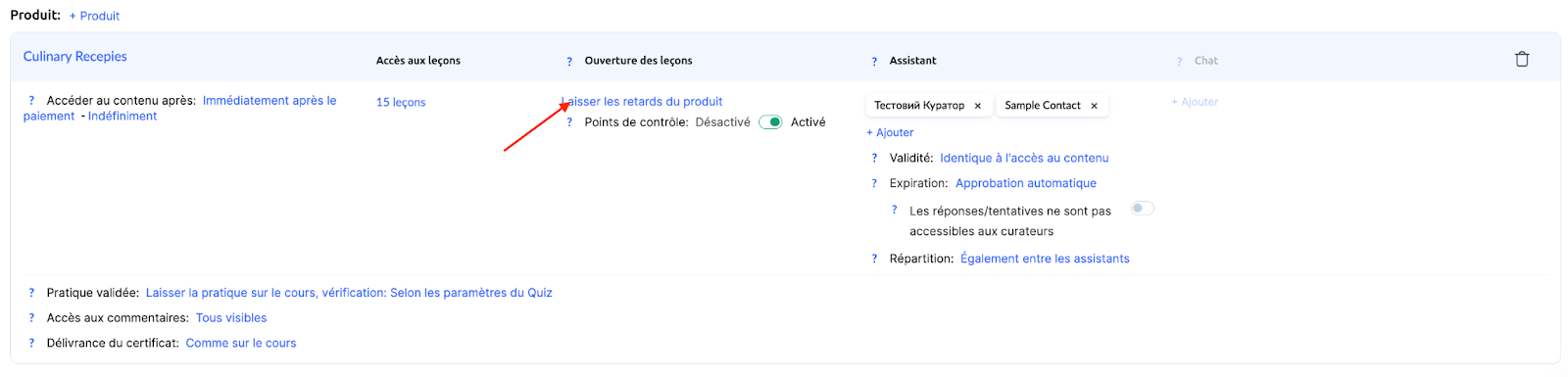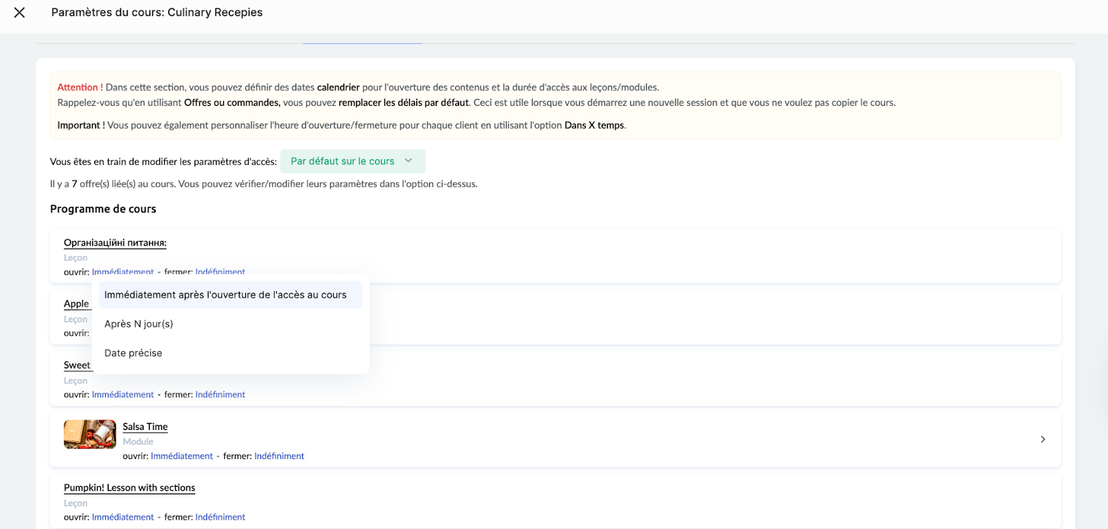 Sur une page séparée, vous verrez le programme du cours avec la possibilité de définir des délais pour les leçons et les modules.
