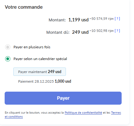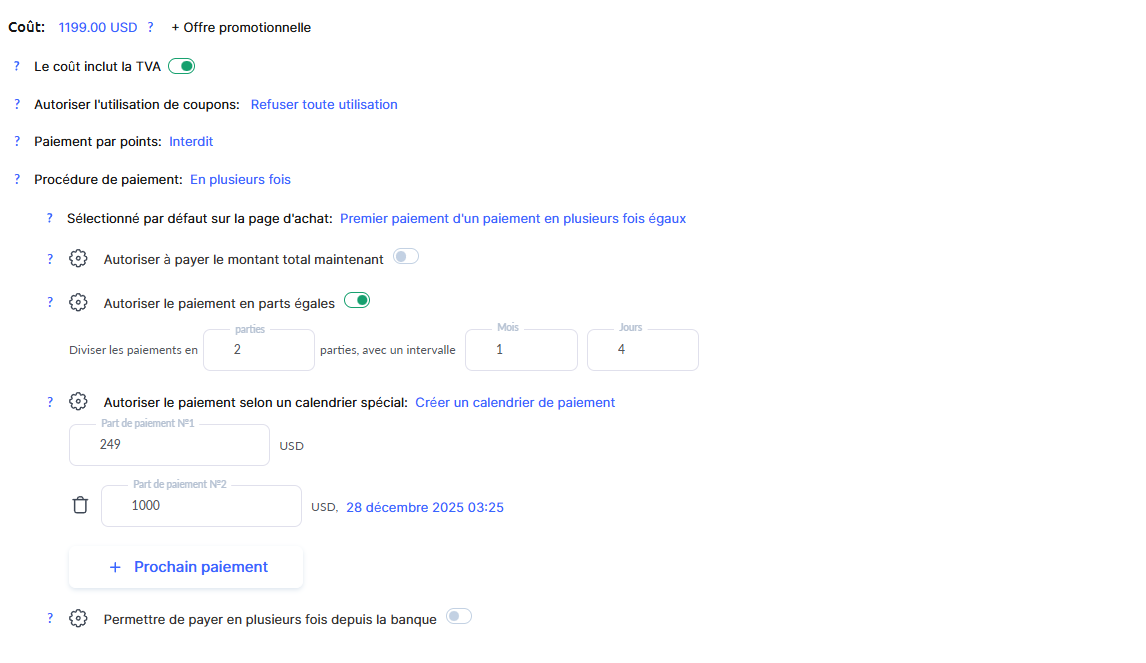 De plus, dans l’exemple, le paiement intégral de 1199 est autorisé. Vous pouvez permettre le paiement immédiat du montant total et indiquer un montant total plus élevé, par exemple 249 + 1000, afin d’encourager ceux qui préfèrent payer la totalité dès le départ.