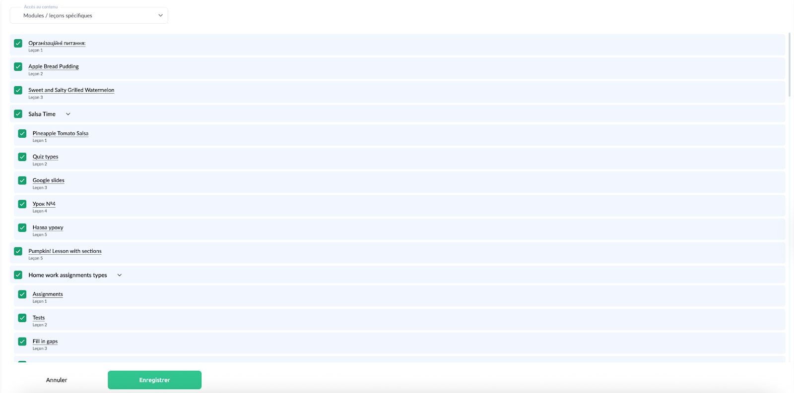 Sélectionnez Modules ou leçons spécifiques. Cochez les cases correspondant aux leçons qui doivent être disponibles dans cette offre, puis cliquez sur « Enregistrer ».