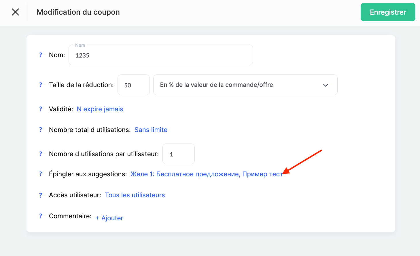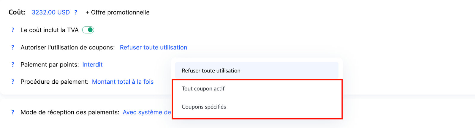 De plus, dans les paramètres de l’offre, vous devez indiquer que les coupons peuvent s’appliquer à celle-ci. Pour ce faire, allez dans les paramètres de l’offre, puis dans la section « Autoriser l’utilisation de coupons », sélectionnez la troisième option et indiquez le coupon que vous avez créé.