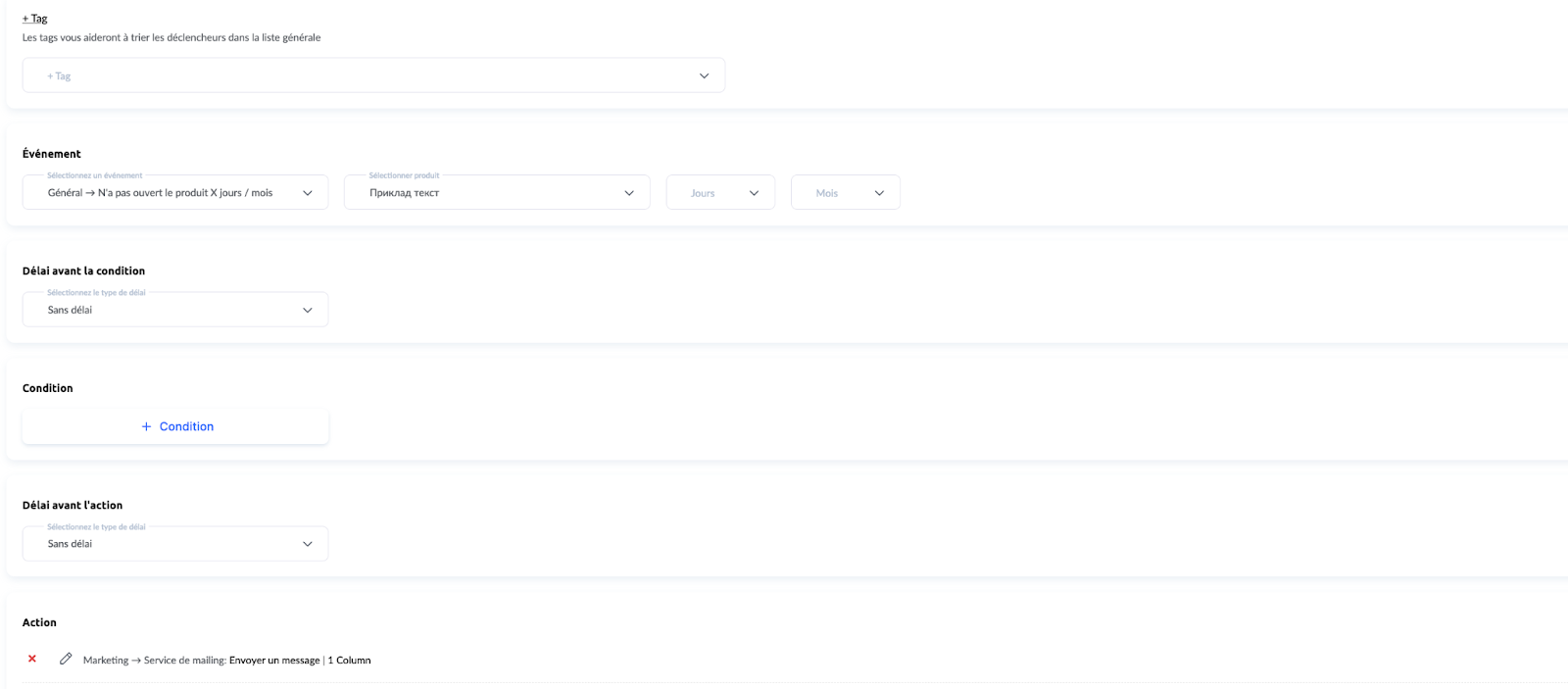 Il n’est pas nécessaire de sélectionner un événement pour ce déclencheur, car il sera activé par l’action du déclencheur précédent dans le scénario actuel.