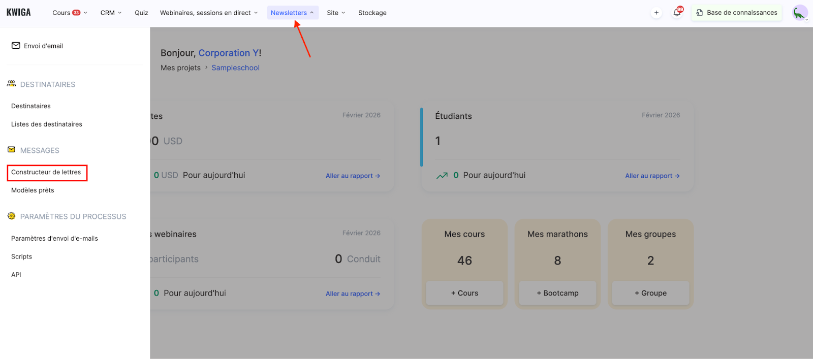 Pour ce faire, allez dans la section « Newsletters » et, sous « MESSAGES », sélectionnez l’option « Constructeur de lettres ».