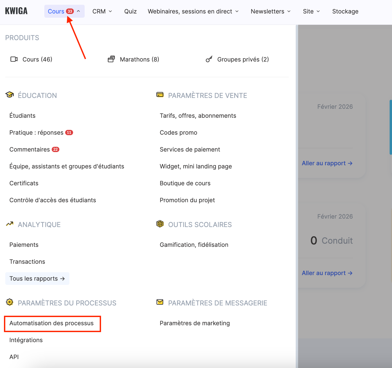Pour créer l’automatisation, allez dans la section « Cours » et, sous « PARAMÈTRES DE PROCESSUS », sélectionnez l’option « Automatisation des processus », puis cliquez sur « +Scénario ».