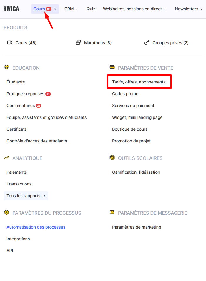 Pour créer une offre promotionnelle, rendez-vous dans Cours – Tarifs, offres, abonnements.