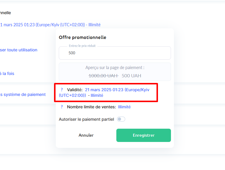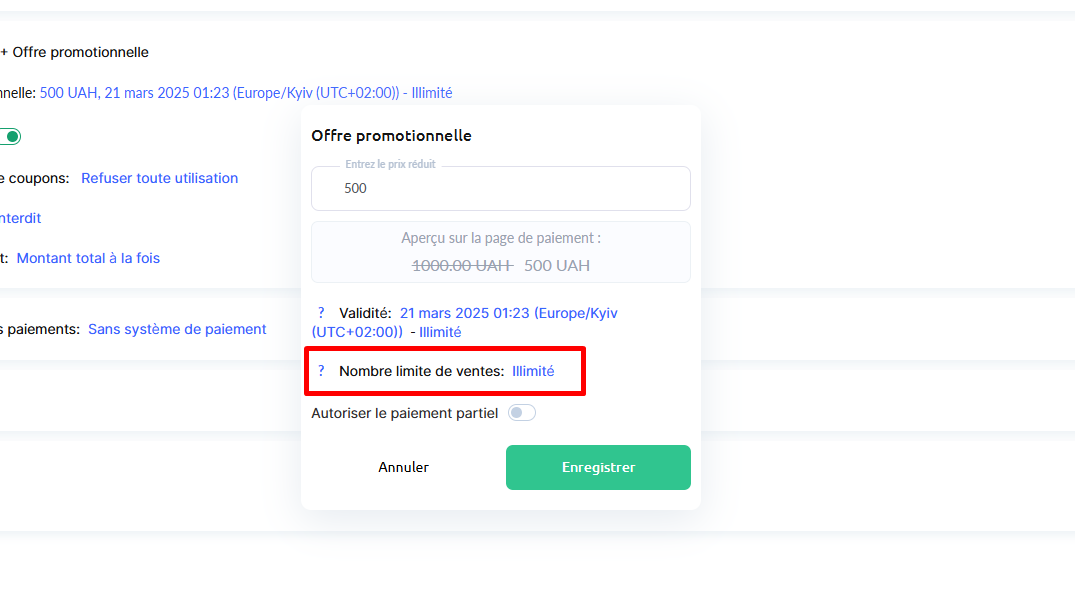 Vous pouvez également limiter le nombre d’achats au prix promotionnel (par exemple, 10 ventes). Si aucun plafond n’est nécessaire, laissez le champ vide ou indiquez 0.