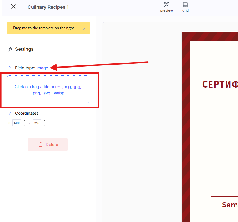 Template size — specify the desired template dimensions in pixels. This is important for correct display and downloading of the certificate.