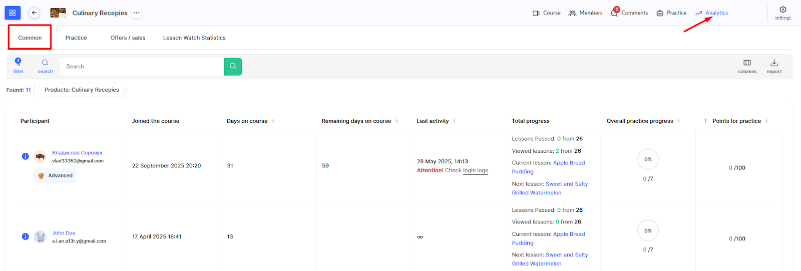For deeper analysis of participants’ progress, go to the course menu Analytics → Common tab.