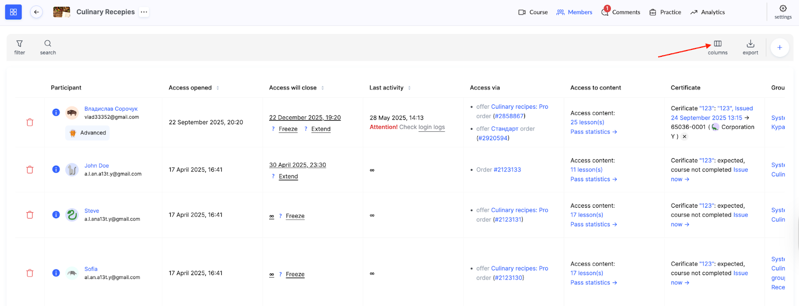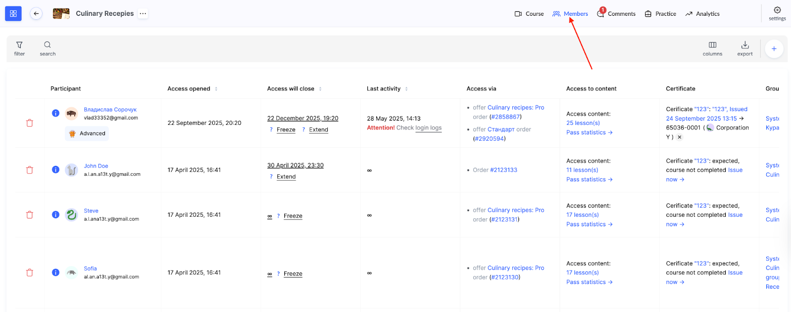 On this same tab, you can also manage course access: extend or temporarily freeze it, manually issue a certificate, or completely remove a participant from the course. All the key tools for managing participants are gathered in one place.