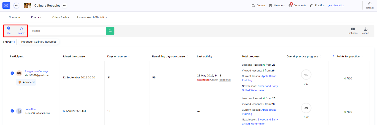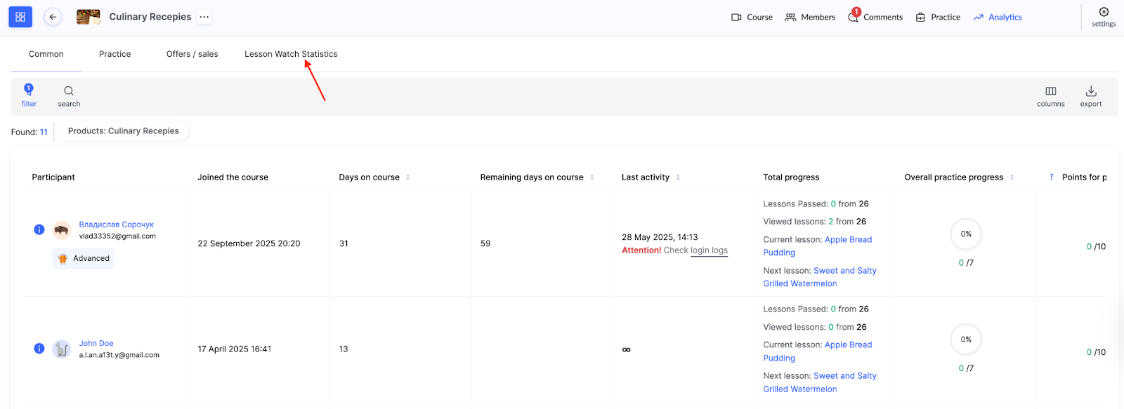 In addition to basic information, data on learning progress is available, including the percentage of lessons viewed and practical assignments completed. These indicators allow you to instantly assess how actively a participant is progressing through the course and whether they are completing the practical tasks.