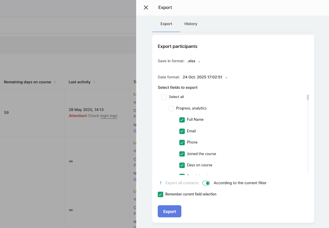 For even more detailed analysis, click the Export button to download an extended report. In the export settings, you can select which fields to include in the report and choose the file format for export (CSV or XLSX).