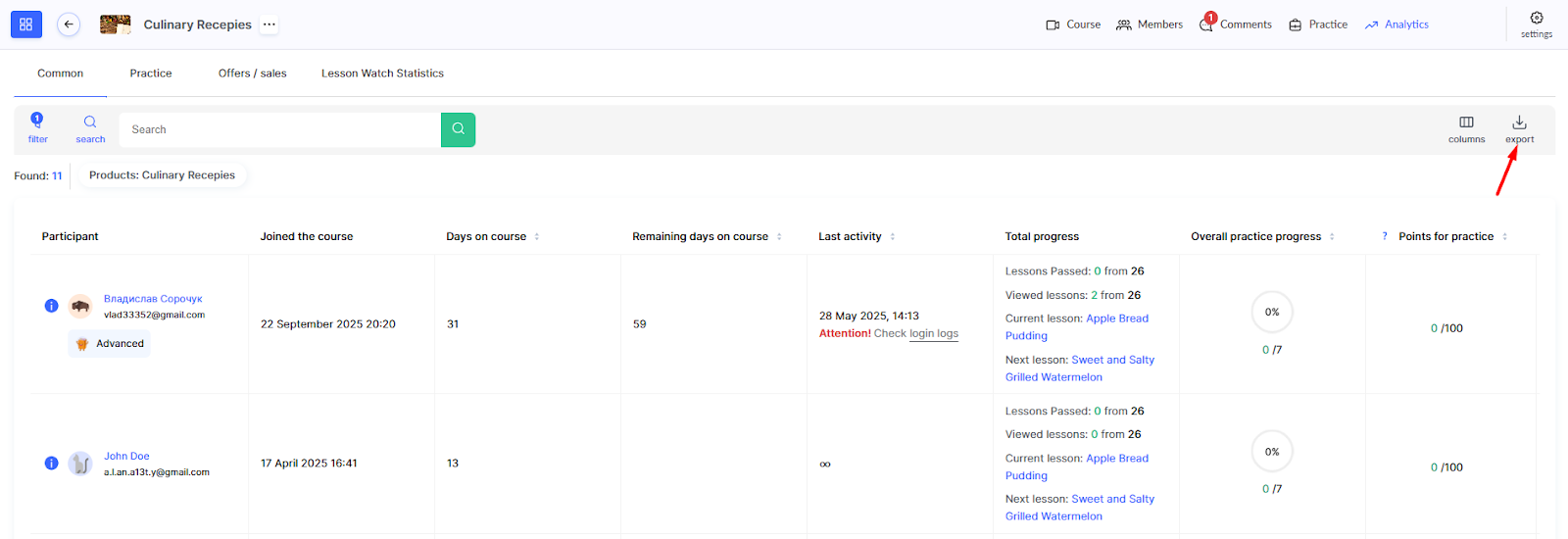 In addition to students’ personal information, you can obtain data on each lesson or practice individually. Click Export, and you’ll receive a file listing all viewed lessons, the completion status of each task, and the points earned for every practice.