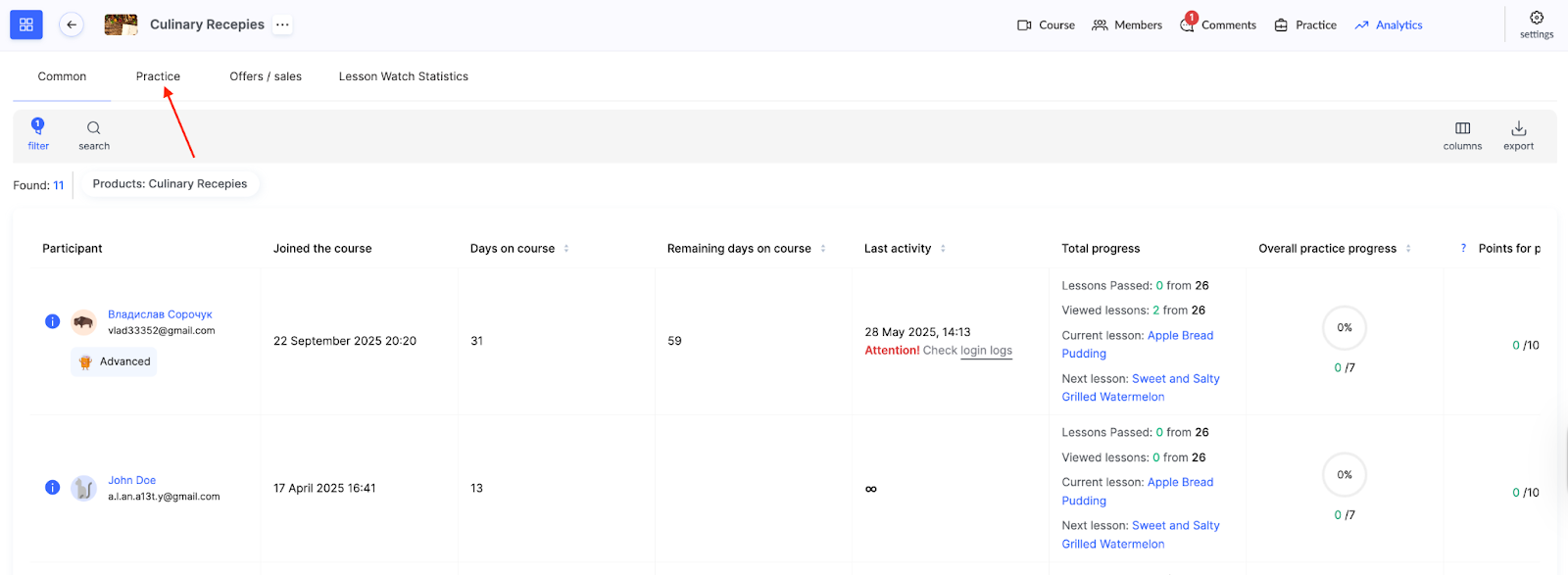 The Practice tab within the course analytics section allows you to track participants' completion of practical assignments. This report helps evaluate their progress, analyze results, and identify areas that need improvement.