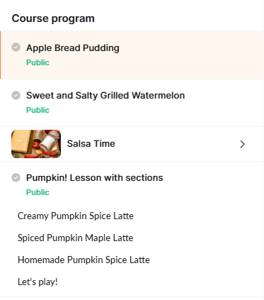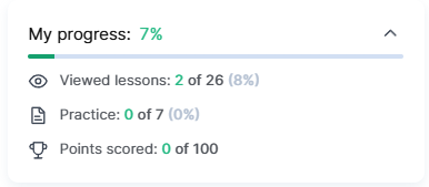 On course pages, participants see a “My Progress” block showing their overall completion percentage. It displays the number of lessons viewed out of the total, the number of completed practical assignments, and the total number of points earned.