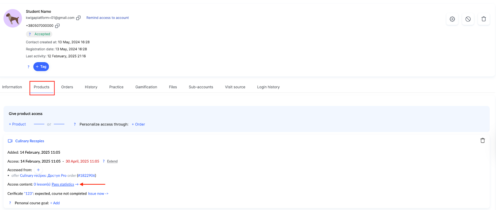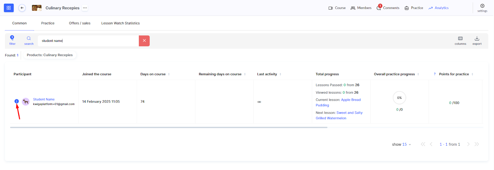 Here, you can see the participant’s enrollment date, how many access days have been used and how many remain, the total progress percentage, and the percentage of completed practices. You’ll also find the points earned for practical assignments and the date of last activity. I