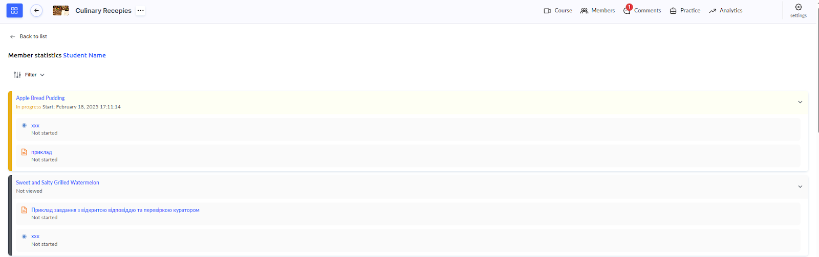Here, you can access the full statistics of this person’s lesson progress and practical assignment completion within the course.