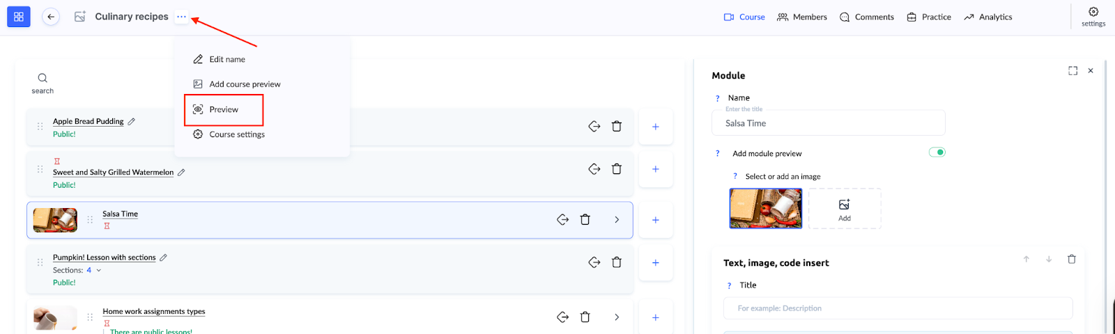 To see how the course looks for different users, click the three dots next to the course title at the top, then select Preview.