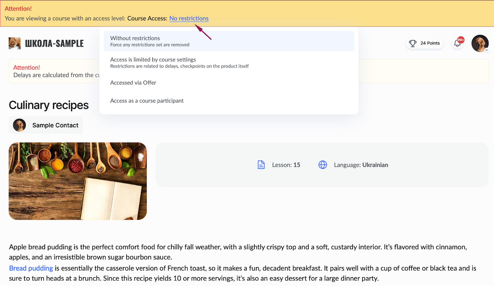 The course is shown as it appears to users who have gained access through a specific offer. This mode allows you to verify that all restrictions and conditions are properly configured. Use it to review price plan settings or specific flows to ensure everything works as intended.
