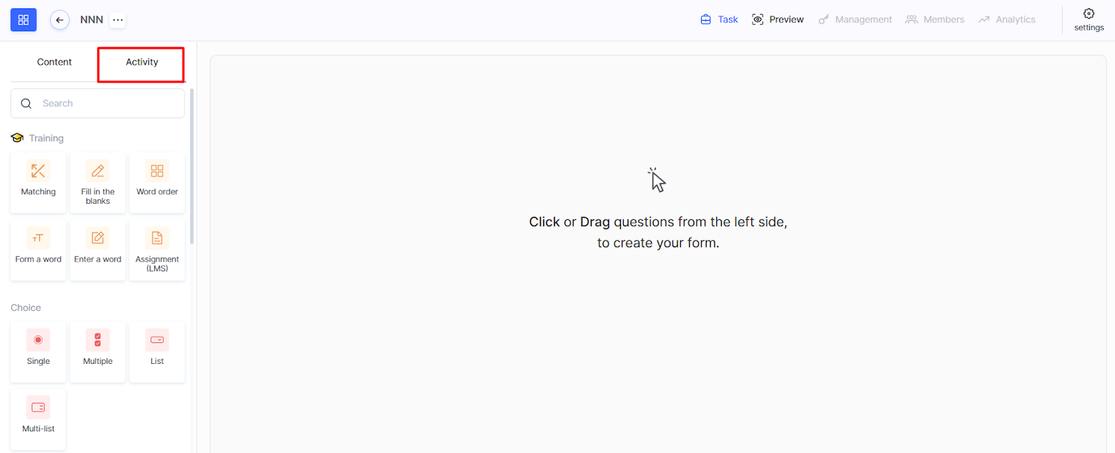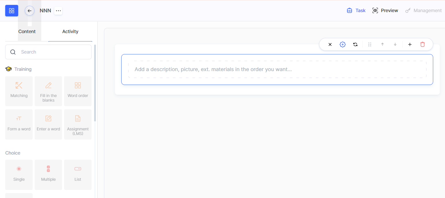 Fill in and configure the selected activity—for example, add questions and answer options.