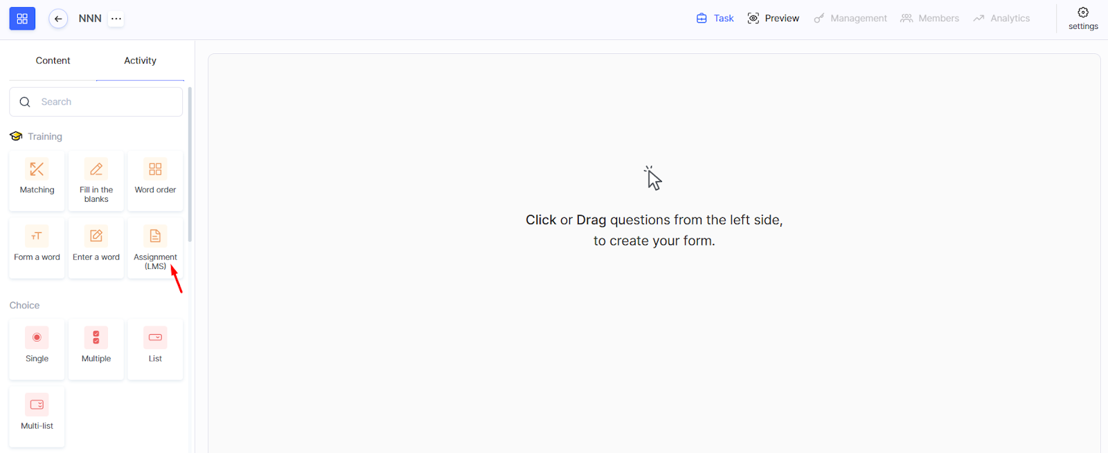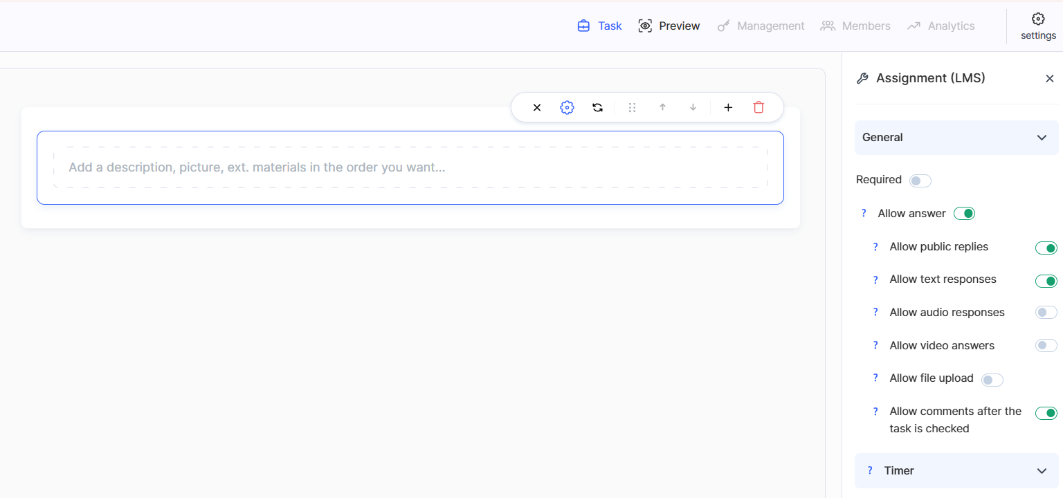 Recommendation: For the Assignment (LMS) type, it is not possible to add additional questions. Use this type when you expect a detailed response or when students should read and reply to curator comments.