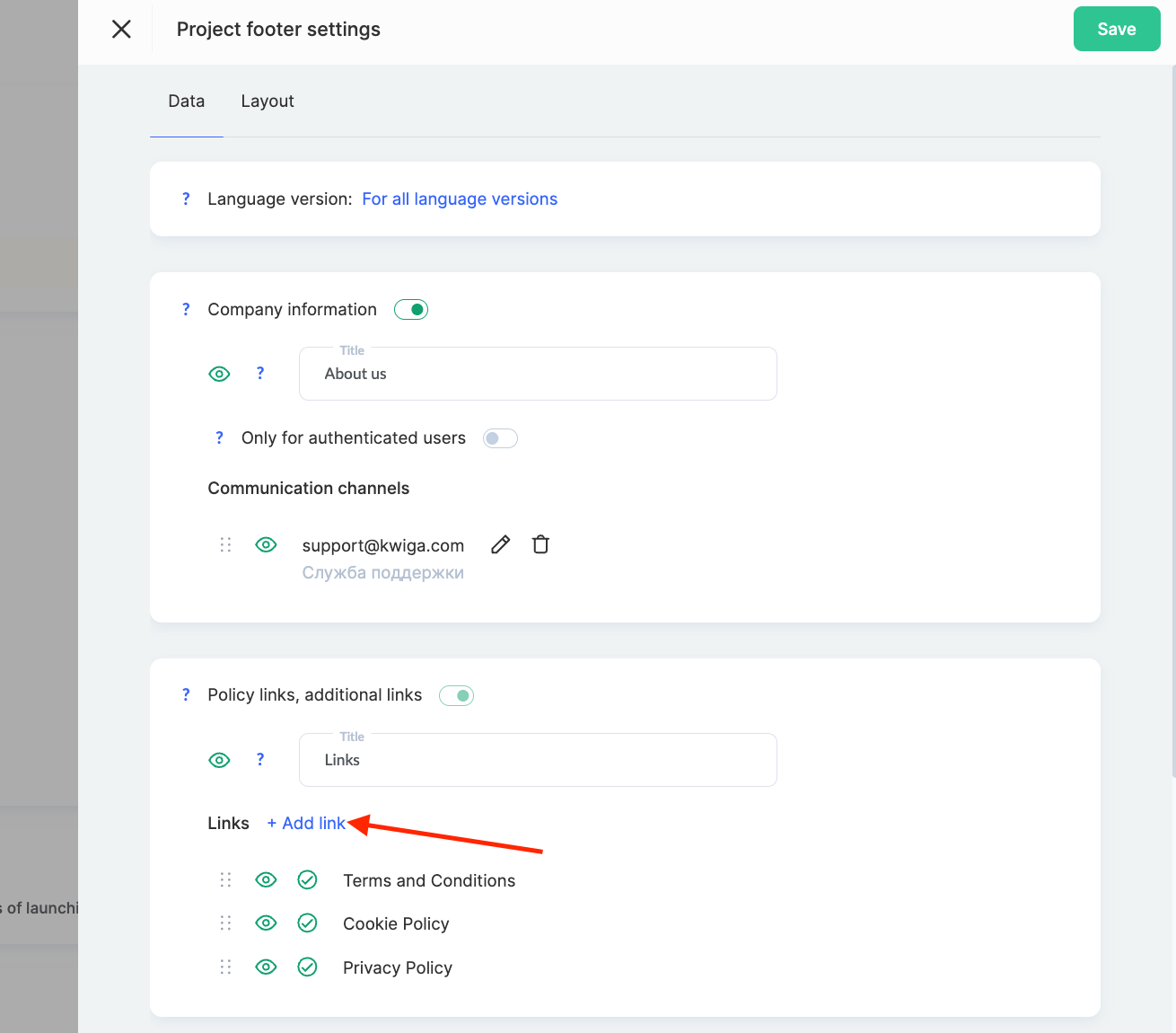 The system allows you to configure language versions for an international audience, enable or disable the Company Information block, and add your own links using the Add Link button.