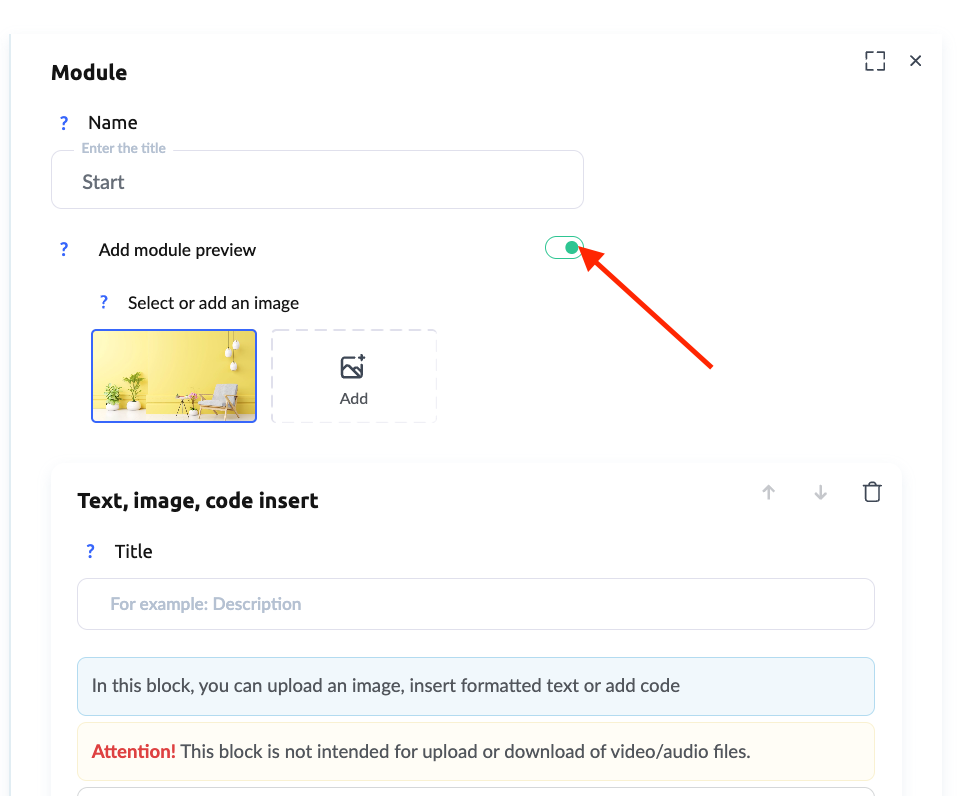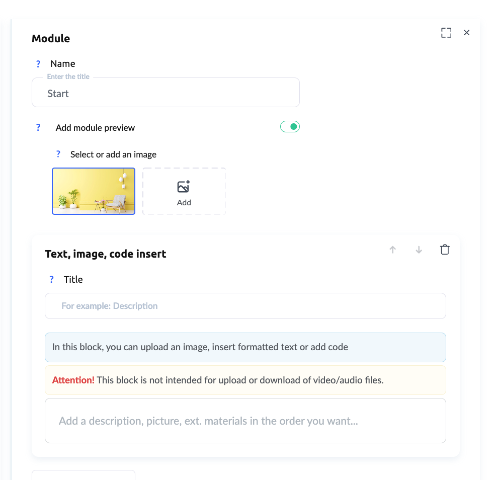 If a course consists of modules, you can make them more expressive by adding a preview image next to the title. This simplifies navigation through the course program and adds visual appeal to the product.