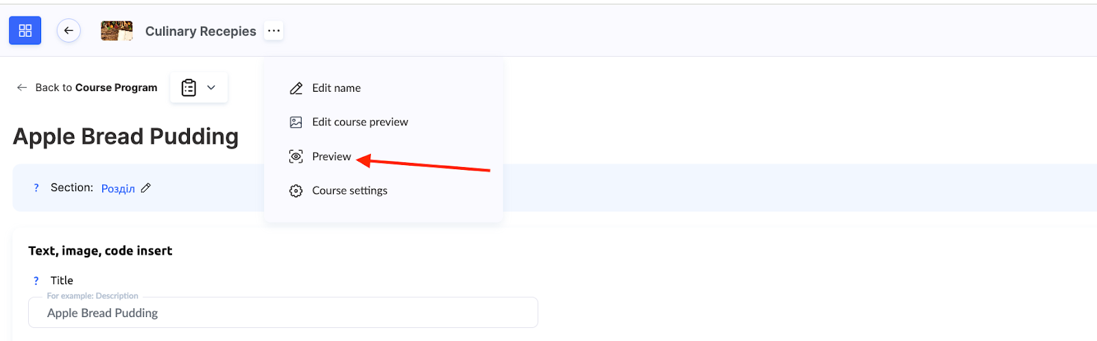 Before launching a course, it is important to check how it will be seen by students. For this purpose, the platform provides a Preview function, which allows you to evaluate the design, check the correct display of materials, and ensure that the course structure is user-friendly.