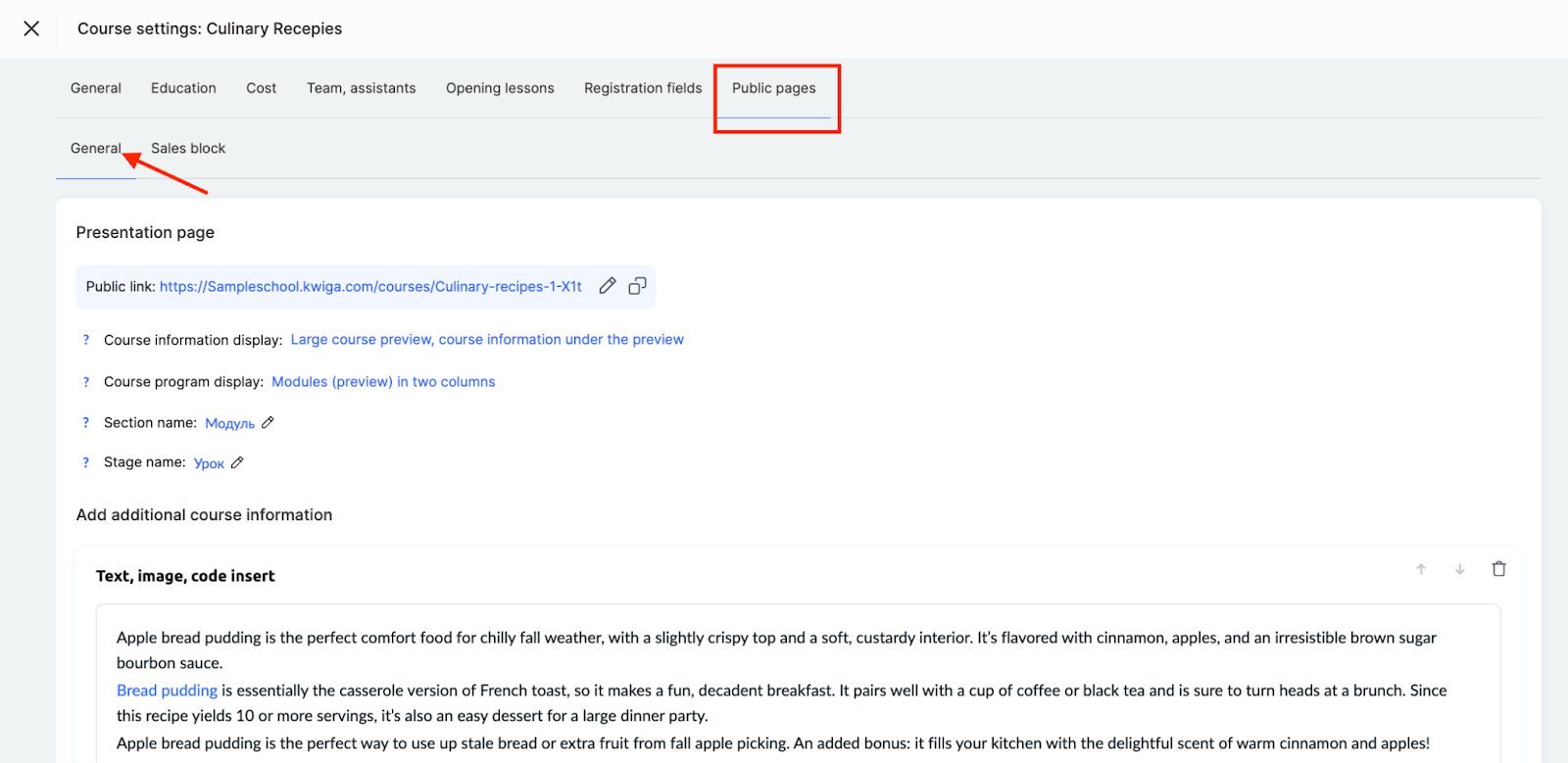 If you plan to use the school link, it is important to set up the general presentation page of your online school. This is the first thing potential students see—the course catalog. This is not mandatory—the page can be left empty if you need to hide courses on the homepage.
