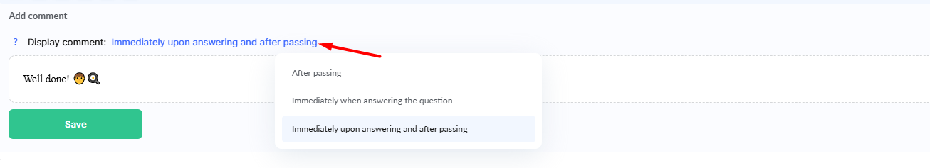 If you choose the option Immediately after answering the question, the comment will appear right after the student submits their answer. This allows them to get instant feedback and understand the logic during the test itself.