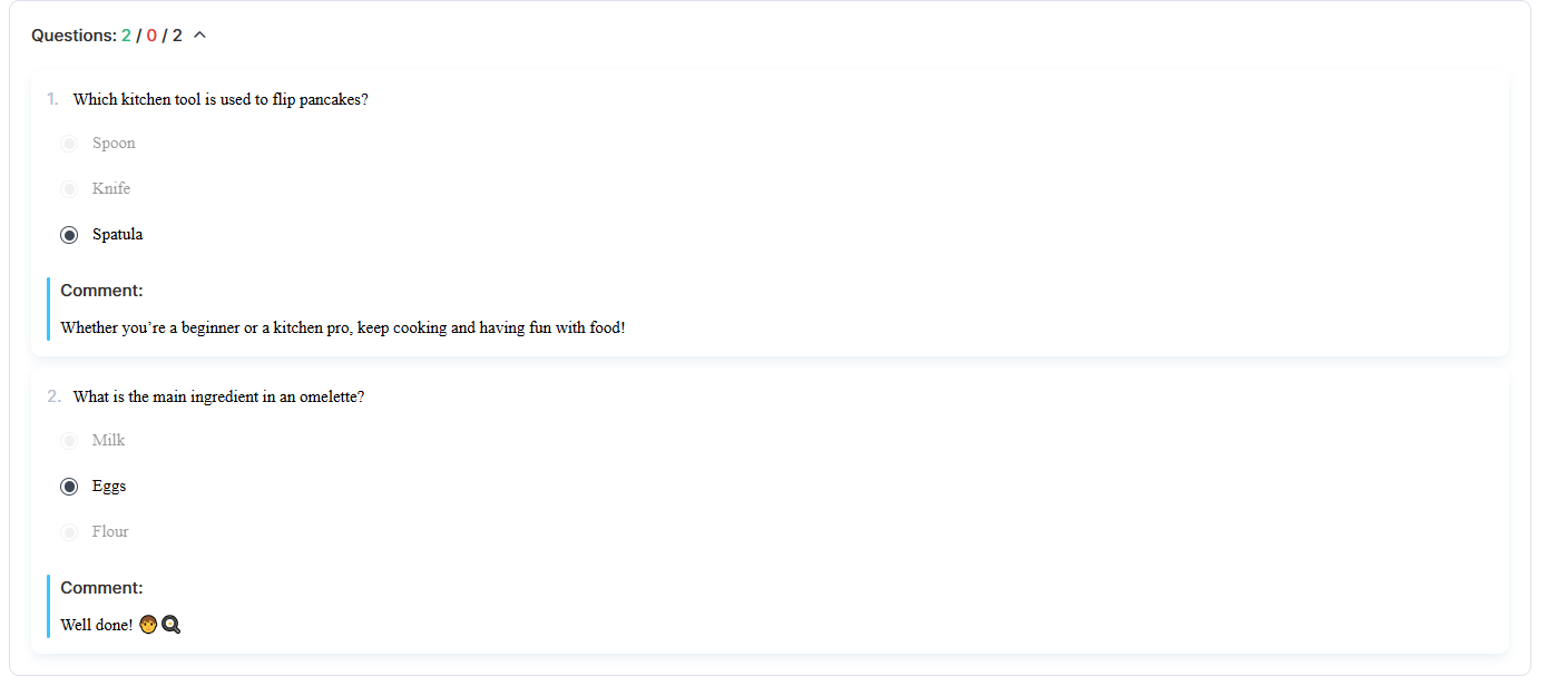 Pay attention! For students to see their answers and comments after completing the quiz, you must enable the appropriate result display settings. Read more in the article How to set up a test so that the student can see their answers.