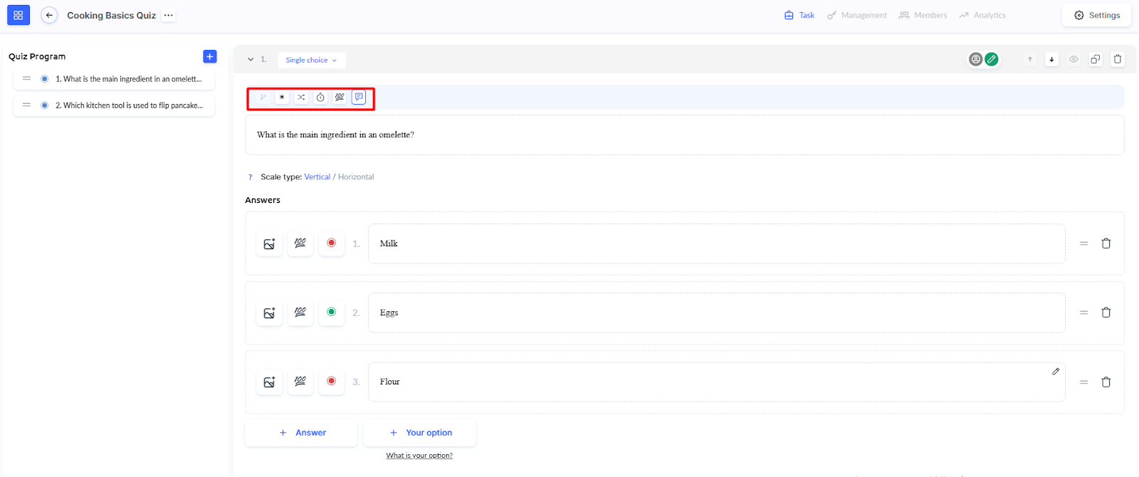 Add the question text and answer options using the +Answer button. If the question type implies a correct answer, mark it green.