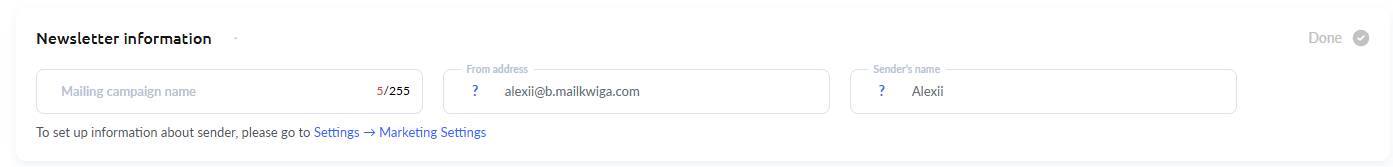 The newsletter title is only visible to you, so you can fill it in as you wish. It will be displayed in the general list of all newsletters. Next to it, there are two non-editable fields for the sender's address and name — this is what the recipients will see in your emails. You can change these settings by going to Settings - Marketing settings (use the link below these fields!)