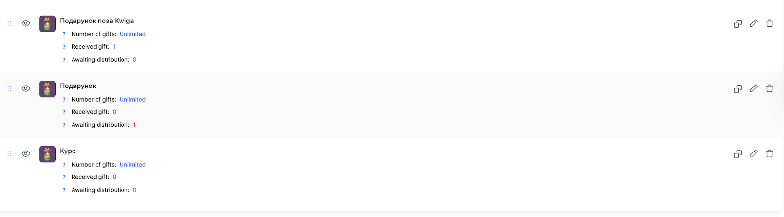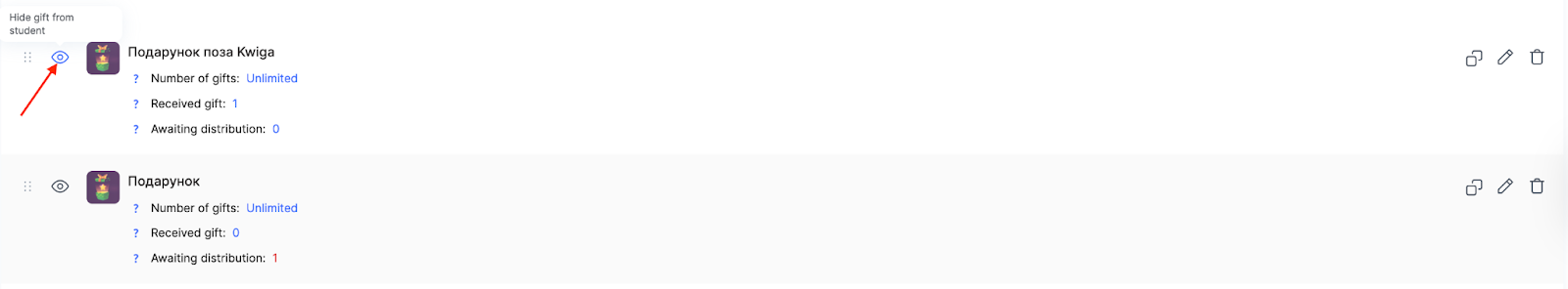 For each gift, the following actions are available: managing visibility for students, duplicating, editing, and deleting. The eye icon allows you to show or hide the gift in students’ profiles.