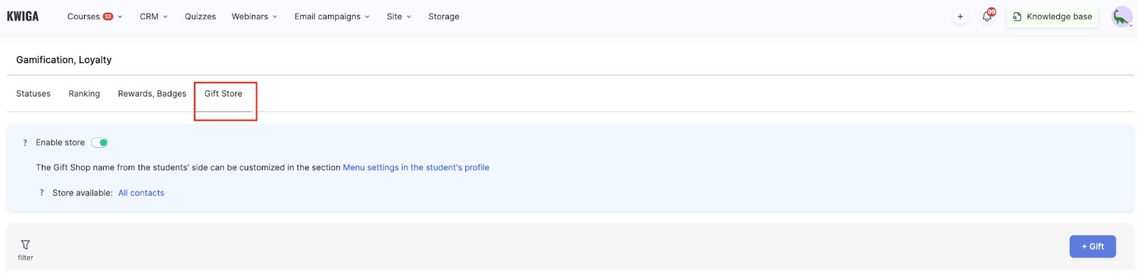 Enable Gift Shop — the toggle allows you to show or hide the shop from students.