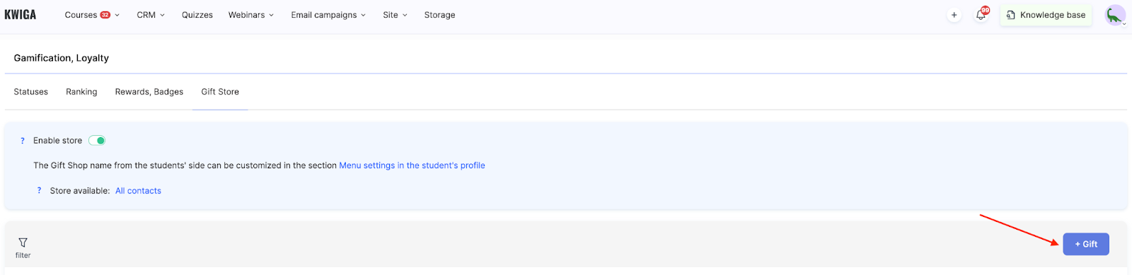 The Gift Shop is a convenient gamification tool on the Kwiga platform that allows you to create rewards to motivate your students. With this functionality, you can encourage student activity by giving them the opportunity to exchange, for example, accumulated points for various gifts.