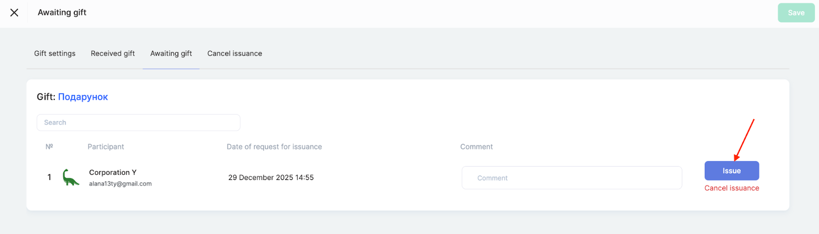 On the “Pending gifts” tab, you can add a comment visible only to the administrator and click “Issue” or “Cancel issuance.”