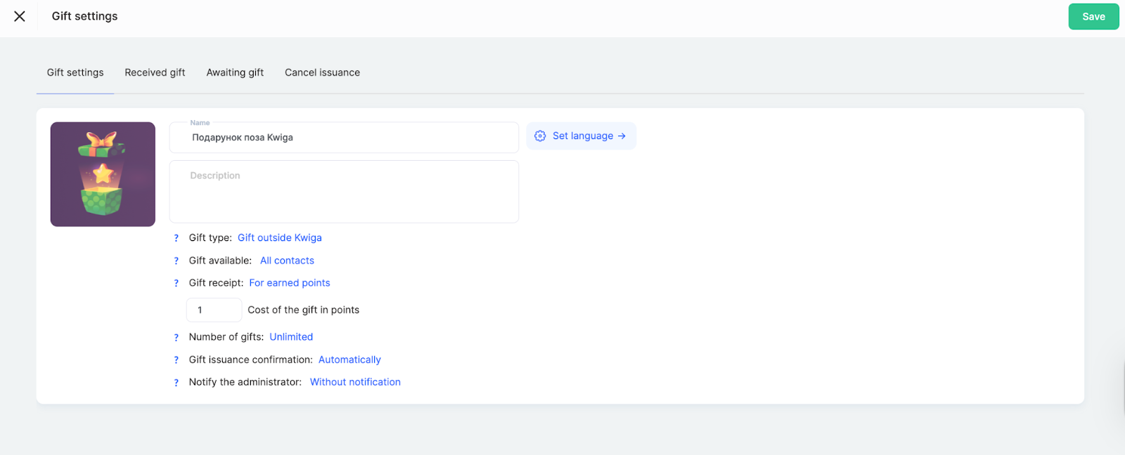 Gift outside Kwiga means that you add an image and description of the gift and then deliver it to the participant by any available method outside the platform.