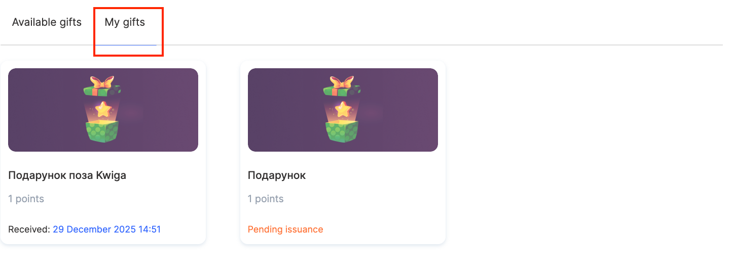 In automatic mode, access is granted instantly. If gift delivery confirmation is set to “By administrator,” the gift appears on the “My Gifts” tab with the status “Pending delivery.”