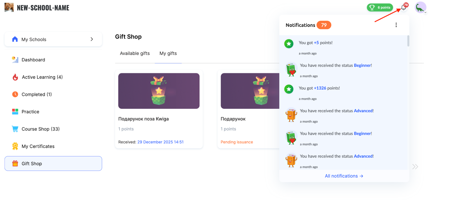 Title personalization — change the default name “Gift Shop” to any other via the student profile settings.