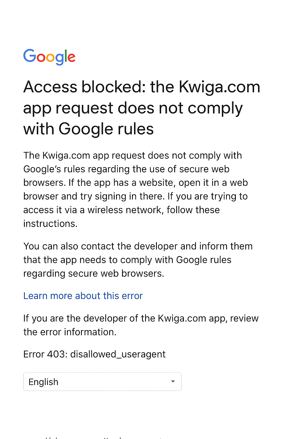 This message is not related to the platform settings and cannot be fixed! It occurs when logging in via a Google account using the in-app browsers of Instagram, Telegram, etc., on mobile devices, regardless of whether the login is on the Kwiga platform or any other service. Logging in through regular browsers like Chrome, Firefox, Opera, Safari, etc., via a Google account works without any issues.