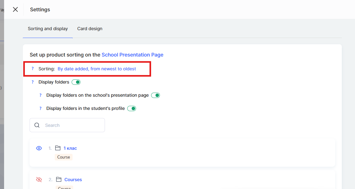 Here you can sort products in a convenient order so that, for example, important courses or marathons appear at the top of the page. These settings apply both to students and to the administrative panel (in the expert dashboard).