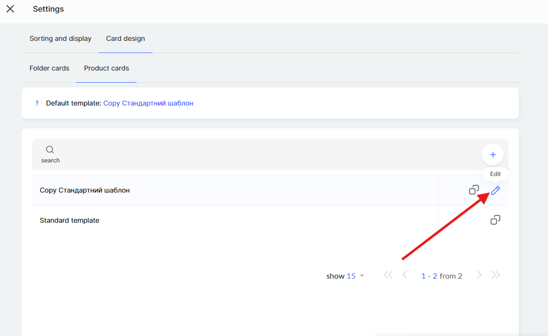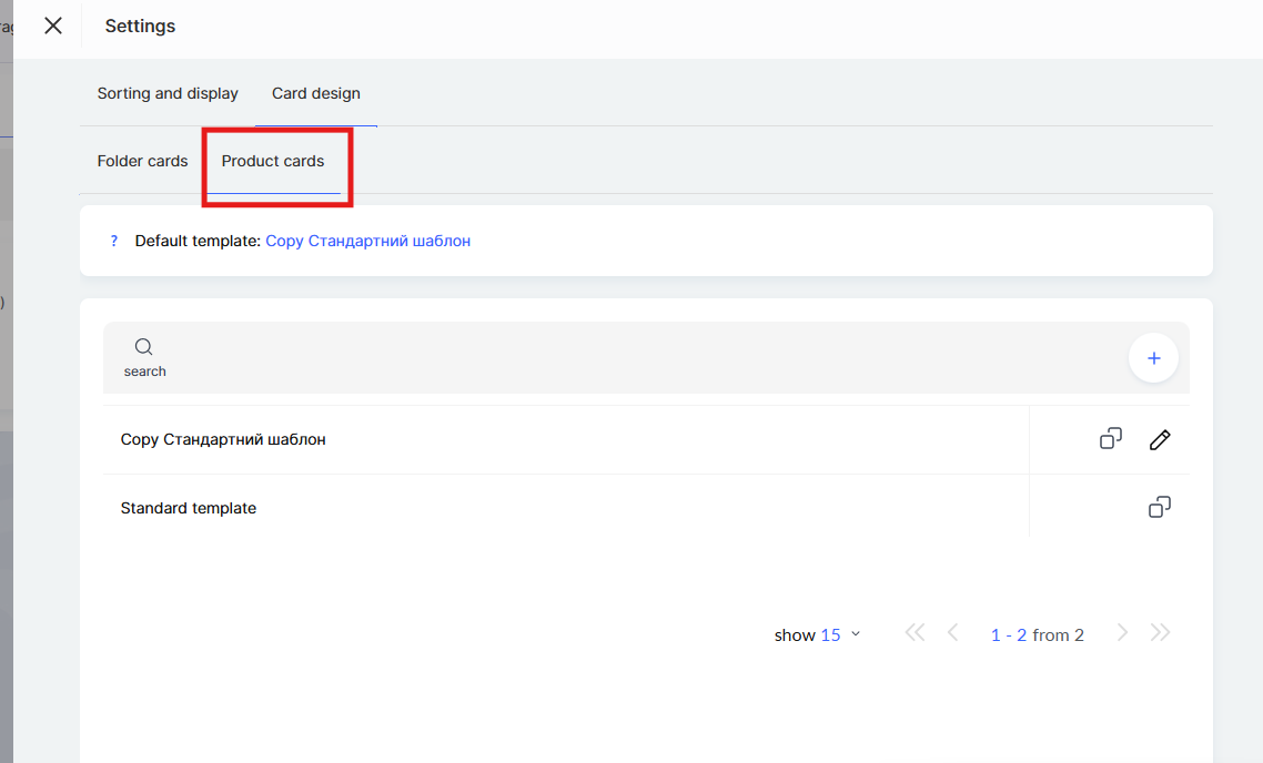 To configure the folder design, go to the Courses menu, open the required section of the Products block, click Settings, and then go to the Card Design → Folder Cards tab.